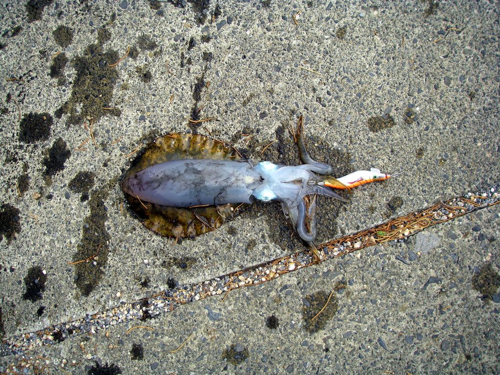 まずは、エギングポイント選びの大鉄則「スミ跡のあるポイントを探せ」です。イカ釣りというのは魚釣りと違い、釣れた場所にスミ跡が残ります。そのため、スミ跡を探せばアオリイカのいるポイントが簡単にわかります!スミの量からどれくらいのサイズのアオリイカが釣れたかも予想できるでしょう。エギングでポイント選びをする際は、まずスミ跡を探しましょう!